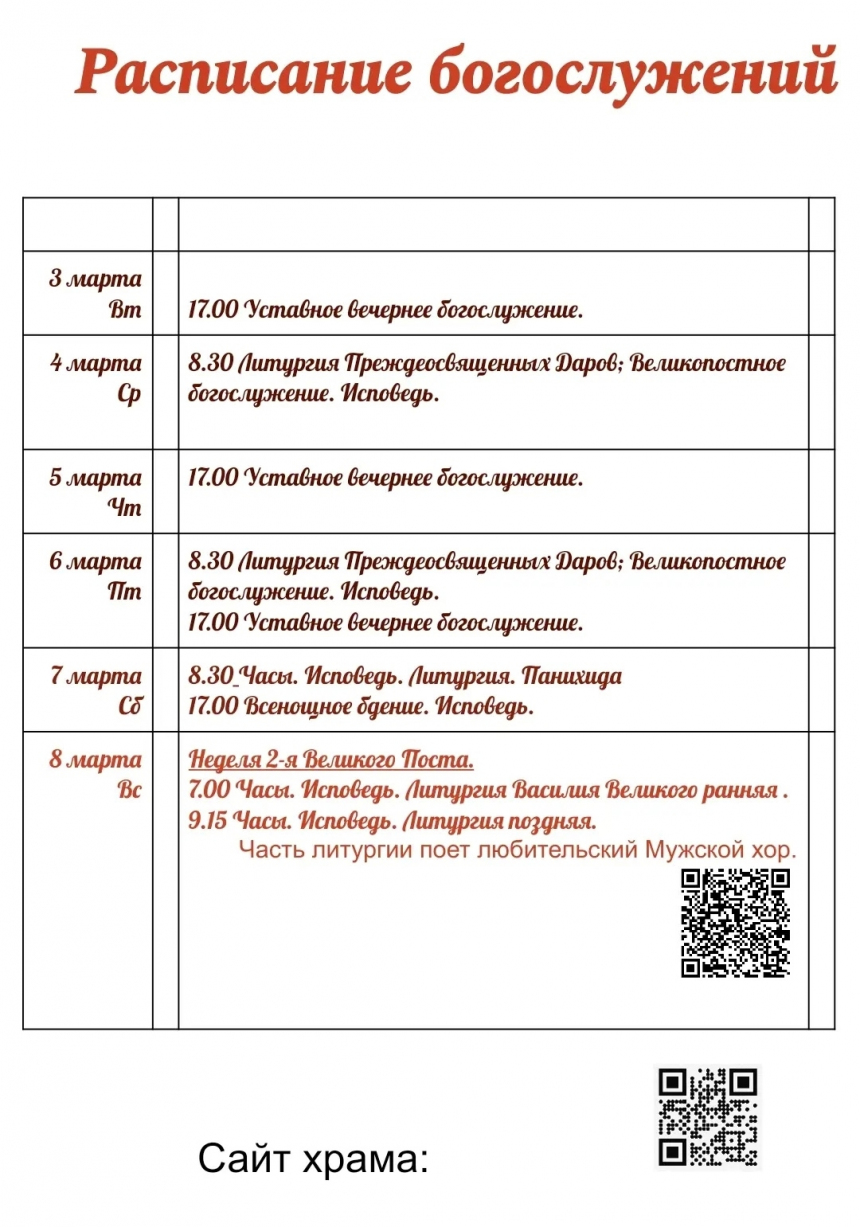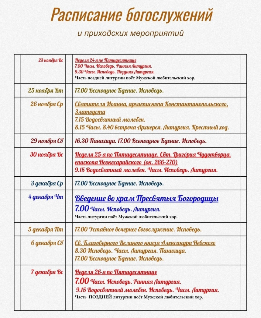 Богослужения совершаются по праздникам, в субботу и воскресенье. В храме дежурит священник.
